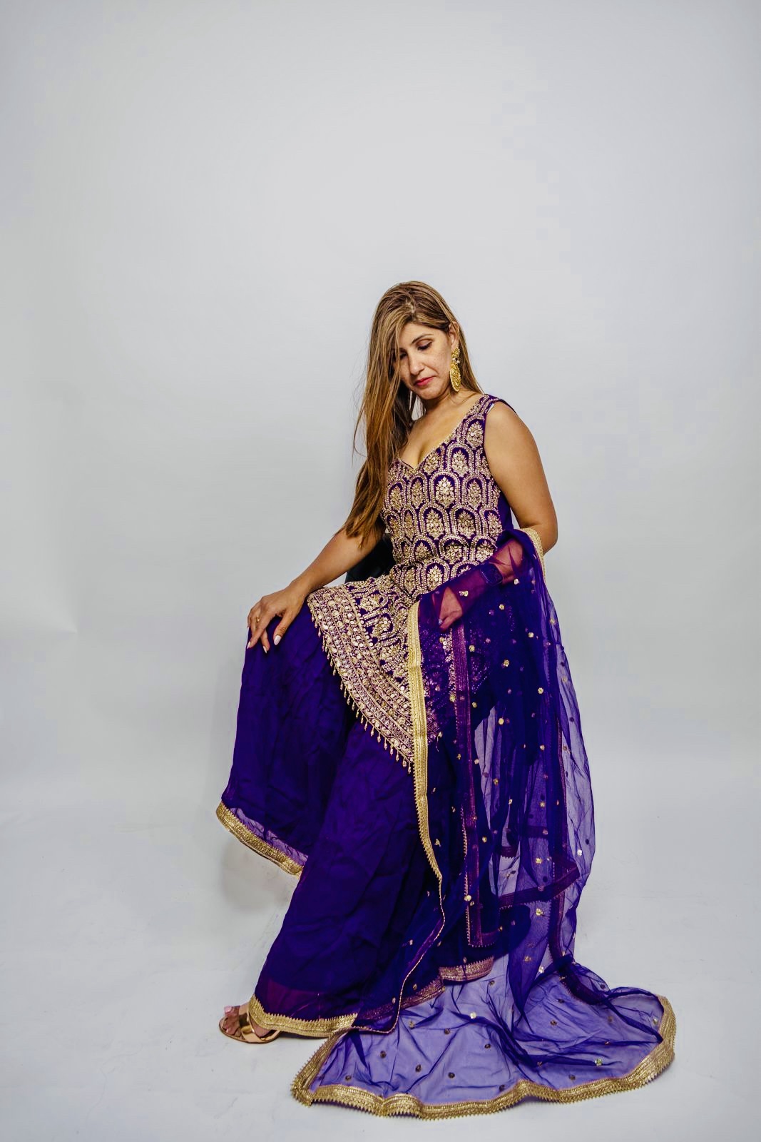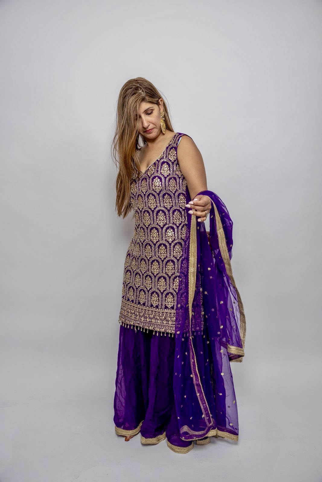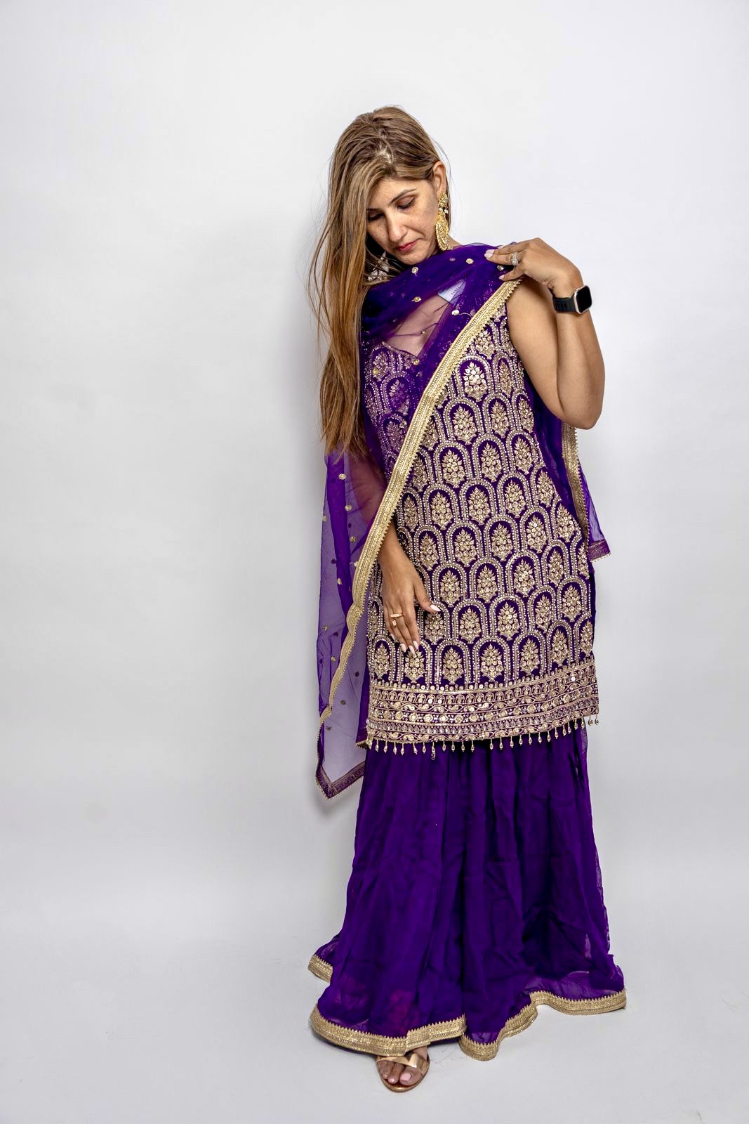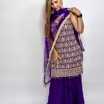 Chiffon Dark Purple Plazzo heavy with Sleeveless Stone with embroidery and silver with border