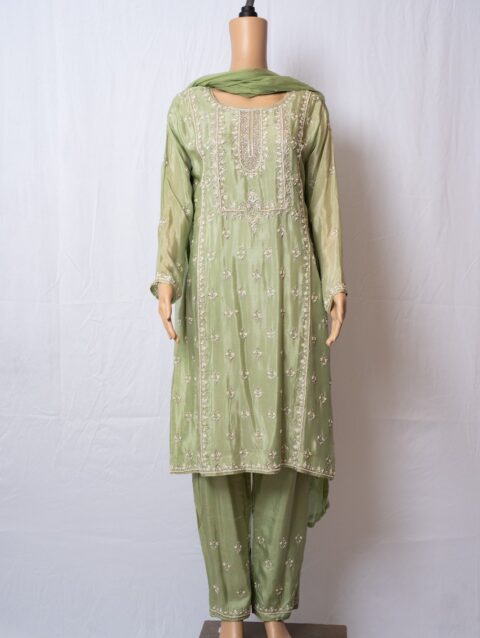 Peach orangish evening gown pure silk with Banarasi dupatta