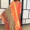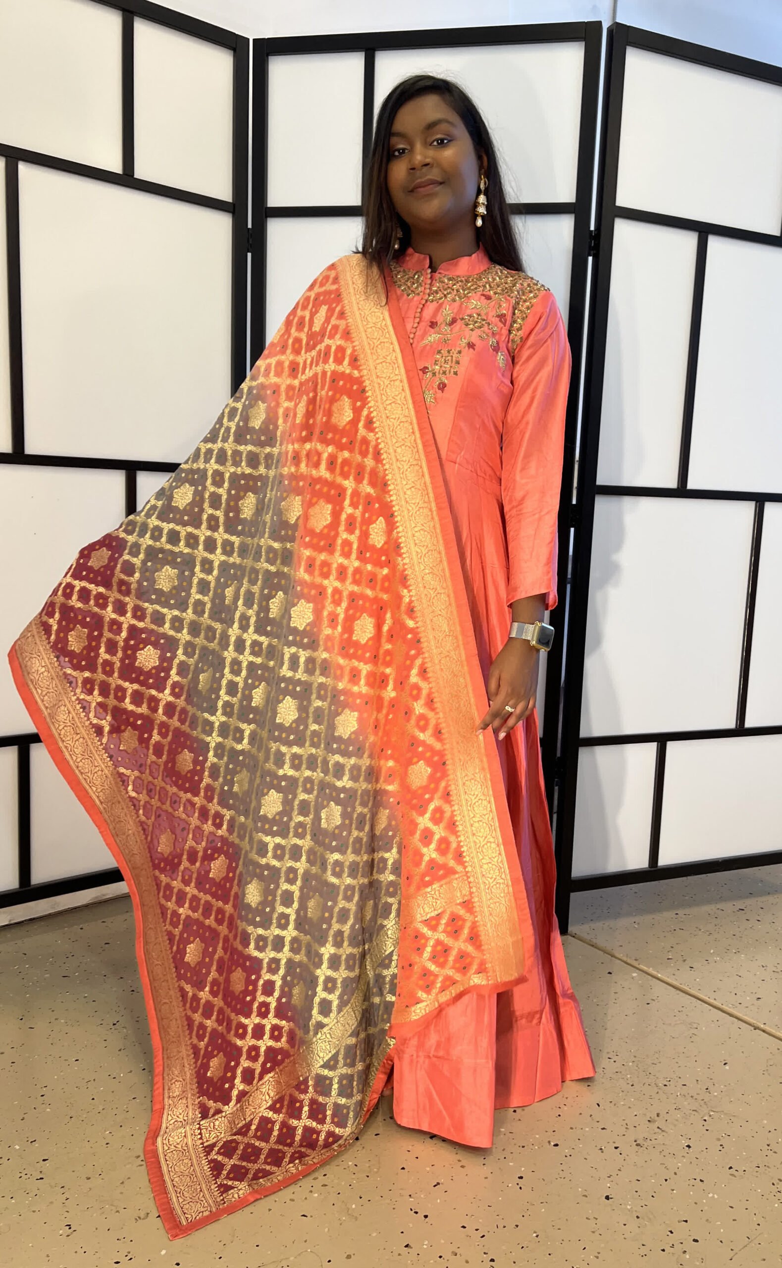 Peach orangish evening gown pure silk with Banarasi dupatta